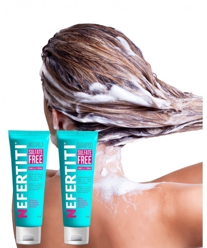¡Disminuye el deslave del tinte y presume un cabello suave, luminoso y sin frizz! Masccarilla Sulfate Free Cabello Teñido de Nefertiti no contiene sal, sulfatos, parabenos o colorantes artificales.