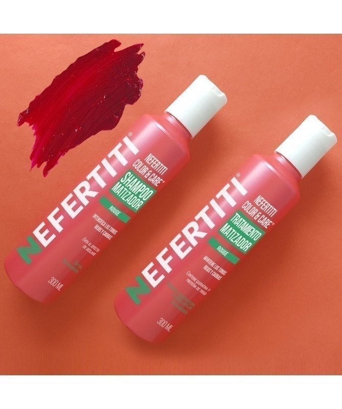 ¡Intensifica y evita el deslave de los tonos rojos y caobas! Shampoo y Tratamiento Rouge de Nefertiti es ideal para matizar e intensificar los tonos rojos y caobas. Evita el efecto de deslave y proporciona brillo y sedosidad.