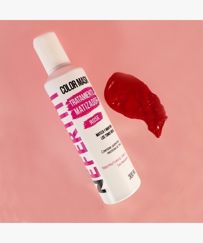 Color Mask Rose de Nefertiti matiza y mantiene los tonos rosas del cabello. Contiene Queratina y Proteína de Trigo que reestructuran el cabello. Debe aplicarse en cabello decolorado, entre más alta la etapa de decoloración será mejor el resultado.